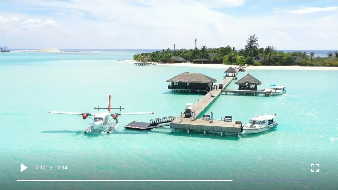 A port with a water plane arriving, boats anchored on a small island of white sand and turquoise blue sea.